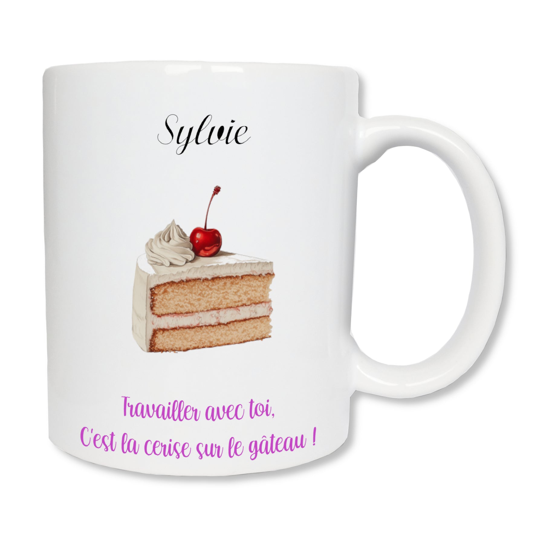 Voici un mug personnalisé qui ravira un ou une collègue de travail avec son prénom et une petite phrase humoristique "Travailler avec toi, c'est la cerise sur le gâteau !".